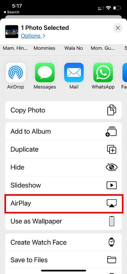 - Select and cast: Select want to cast pictures, tap share icon, and select “AirPlay.” Then select Apple TV from list.