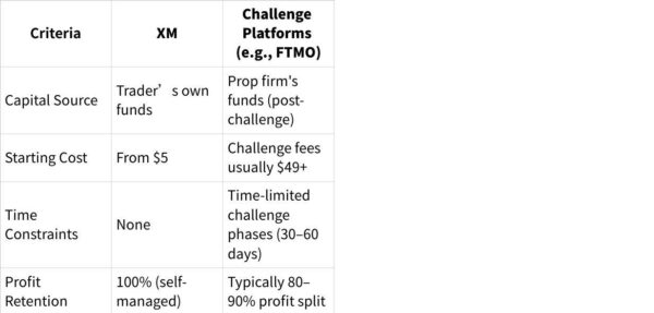 XM operates as a traditional live trading broker, where traders manage their own capital, face no time constraints, and can build a sustainable trading system. In contrast, challenge-based platforms focus on performance-based funding but often have higher pressure, limited timelines, and less regulatory backing.