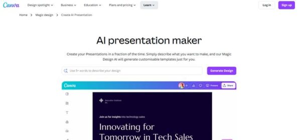 A famous graphic design platform, Canva, has introduced more than 16 AI tools to make the design process easy. It allows people to turn their text into polished presentations. It is ideal for both educators and middle school students for presentation generation.
