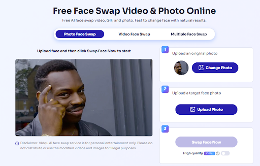 When it comes to online face swap AI, the free tool launched by www.vidqu.ai is a premium choice.