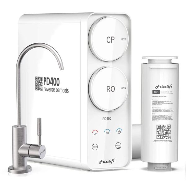 The Frizzlife PD400 utilizes a composite pre-filter and RO membrane with a maximum filtration accuracy of 0.0001 microns. The PD400 under-sink reverse osmosis water filtration system introduces a 5-stage deep filtration mechanism that eliminates more than 1,000 harmful contaminants from the water (99.99%) including lead, chlorine, fluoride, heavy metals, chloramines, VOCs, TDS, scale, arsenic and asbestos, amongst others. RO water filtration systems have a drain ratio as low as 1.5:1 (pure water: drain), saving up to 450% of water compared to conventional systems (1:3). With a capacity of up to 400 gallons per day, the Tankless RO Water Filtration System delivers instantly fresh, pure water to supplied lead-free faucets, filling a glass of water in less than 12 seconds.