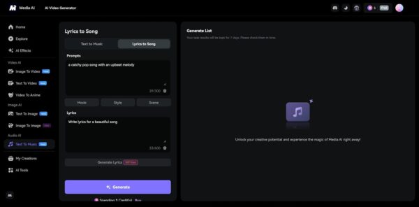 For a fantastic experience, try the Media.io AI Words into Music Generator. This powerful tool effortlessly turns your ideas into complete songs. It also offers multiple options for flexible customization, letting you create music that truly matches your vision. Best of all, it provides a free version and it’s ad-free. Start your musical journey now and bring your words to life with just a click.