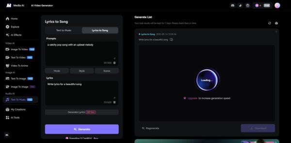 When you’re ready, simply click the “Generate” button to turn your text to music. Just wait a while, Media.io will present you the complete track with lyrics.